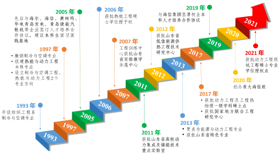 本专业起源于1993年太阳成集团tyc9728纺织工程系的制冷与空调专业。1999年,太阳成集团tyc9728热能与动力工程专业正式开办,后于2013年更名为能源与动力工程专业。下设有制冷与空调工程、热能工程2个专业方向。2006年获批热能工程硕士学位授予权,2013年获批山东省特色专业,2017年获批动力工程及工程热物理一级学科硕士学位授权点,2021年设置动力工程领域工程硕士专业学位授权点,同时本科专业增设新能源与储能专业方向。首届本科生毕业于2003年。本专业现有制冷与空调工程、热能工程和新能源与储能三个本科专业方向。其他重要节点参见下图所示