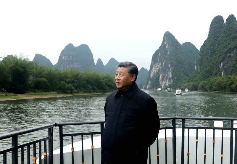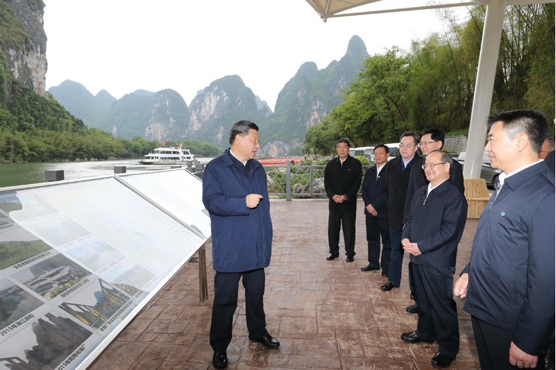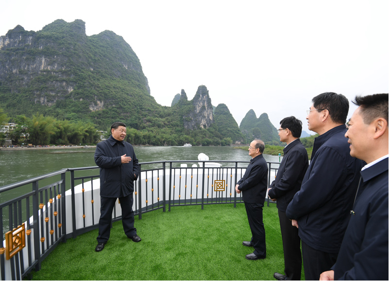近年来,桂林市大力推进漓江“治乱、治水、治山、治本”,改善了漓江生态环境。25日下午,习近平来到桂林市阳朔县漓江杨堤码头,听取漓江流域综合治理、生态保护等情况汇报,并乘船考察漓江阳朔段。他强调,要坚持山水林田湖草沙系统治理,坚持正确的生态观、发展观,敬畏自然、顺应自然、保护自然,上下同心、齐抓共管,把保持山水生态的原真性和完整性作为一项重要工作,深入推进生态修复和环境污染治理,杜绝滥采乱挖,推动流域生态环境持续改善、生态系统持续优化、整体功能持续提升。