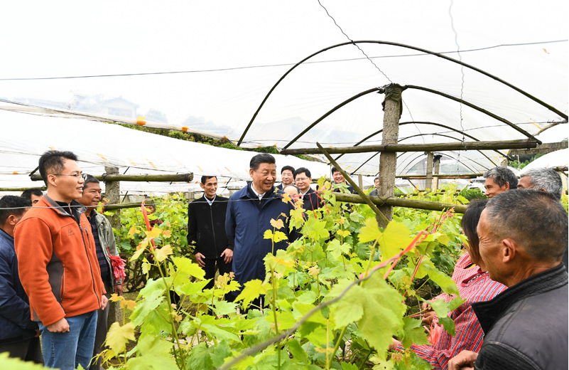 随后,习近平来到才湾镇毛竹山村。该村近年来积极发展葡萄种植业,有力促进了农民增收。习近平走进葡萄种植园,察看葡萄长势。农技人员正在指导村民为葡萄绑蔓、定梢,看到总书记来了,乡亲们纷纷围拢过来。习近平详细询问葡萄产量、品质、销路、价格等情况。他强调,全面推进乡村振兴,要立足特色资源,坚持科技兴农,因地制宜发展乡村旅游、休闲农业等新产业新业态,贯通产加销,融合农文旅,推动乡村产业发展壮大,让农民更多分享产业增值收益。