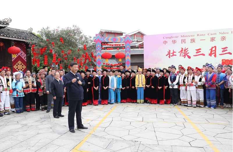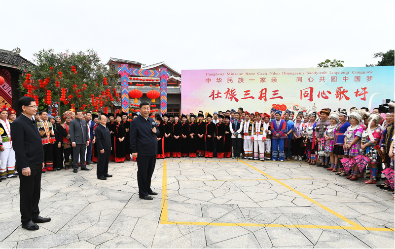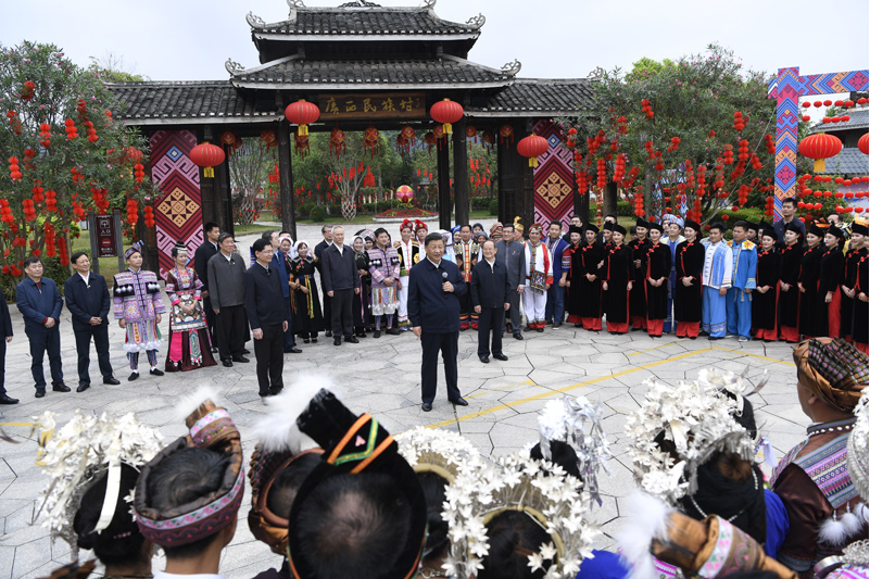 4月25日至27日,中共中央总书记、国家主席、中央军委主席习近平在广西考察。这是27日上午,习近平在南宁市广西民族博物馆外,同参加三月三“歌圩节”民族文化活动的各族群众亲切交流。新华社记者 谢环驰 摄