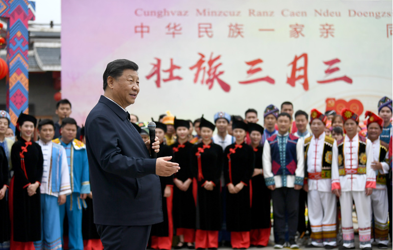 广西是我国少数民族人口最多的自治区。27日上午,习近平来到位于南宁市邕江之畔的广西民族博物馆,参观壮族文化展。博物馆外,三月三“歌圩节”壮族对歌等民族文化活动正在这里集中展示。习近平强调,广西是全国民族团结进步示范区,要继续发挥好示范带动作用。各民族共同团结进步、共同繁荣发展是中华民族的生命所在、力量所在、希望所在,在全面建设社会主义现代化国家的新征程上,一个民族都不能少,各族人民要心手相牵、团结奋进,共创中华民族的美好未来,共享民族复兴的伟大荣光。