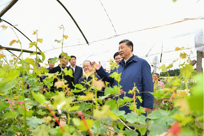 4月25日至27日,中共中央总书记、国家主席、中央军委主席习近平在广西考察。这是25日上午,习近平在桂林市全州县才湾镇毛竹山村,走进葡萄种植园,同农技人员和村民亲切交流。新华社记者 谢环驰 摄