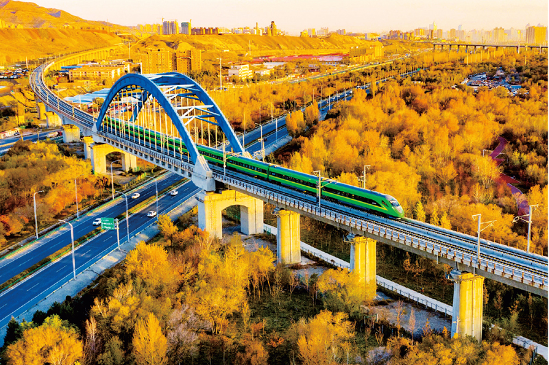 中国标准动车组“复兴号”是我国具有完全自主知识产权、达到世界先进水平的动车组列车,是我国制造业发展的世界名片。图为2020年10月18日,一列复兴号CR200J型电力动车组列车迎着朝阳驶过乌鲁木齐市燕儿窝段。 中新社记者 蔡增乐/摄