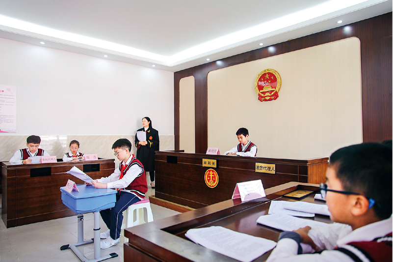 2020年10月30日,安徽省合肥市滨湖世纪社区在合肥师范附小三小开展“模拟法庭进校园”活动。图为当日拍摄的模拟法庭“庭审”现场。 新华社记者 曹力/摄